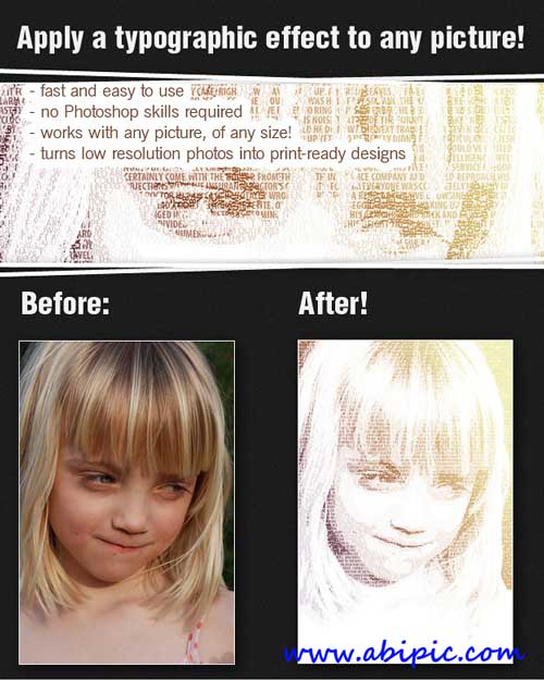 در این پست مجموعه ای از فایل ها و اکشن های فتوشاپ را برای دانلود قرار داده ایم که با کیفیت بسیار بالایی کار می کنند و شما با استفاده از آن ها قادر خواهیدبود که با توجه به تنوع حالت هایی که در ان مجموعه قرار داده شده است عکس های خود را به تصاویر تایپوگرافی بسیار زیبا و حرفه ای تبدیل کنید. نحوه کار با این مجموعه بسیار ساده می باشد و فایل راهنمای استفاده از ان نیز به همراه سایل فایل های مورد نیاز قرار داده شد است.